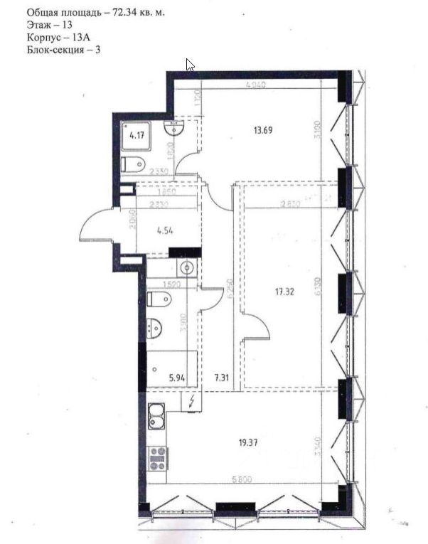 Жилая площадь 31 кв.м., просторная кухня 19.4 кв.м., 2 санузла.
