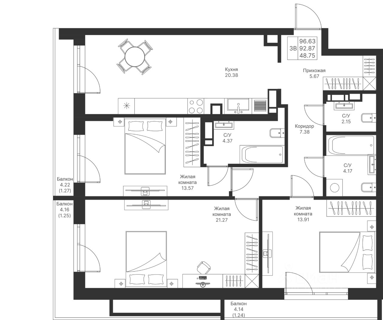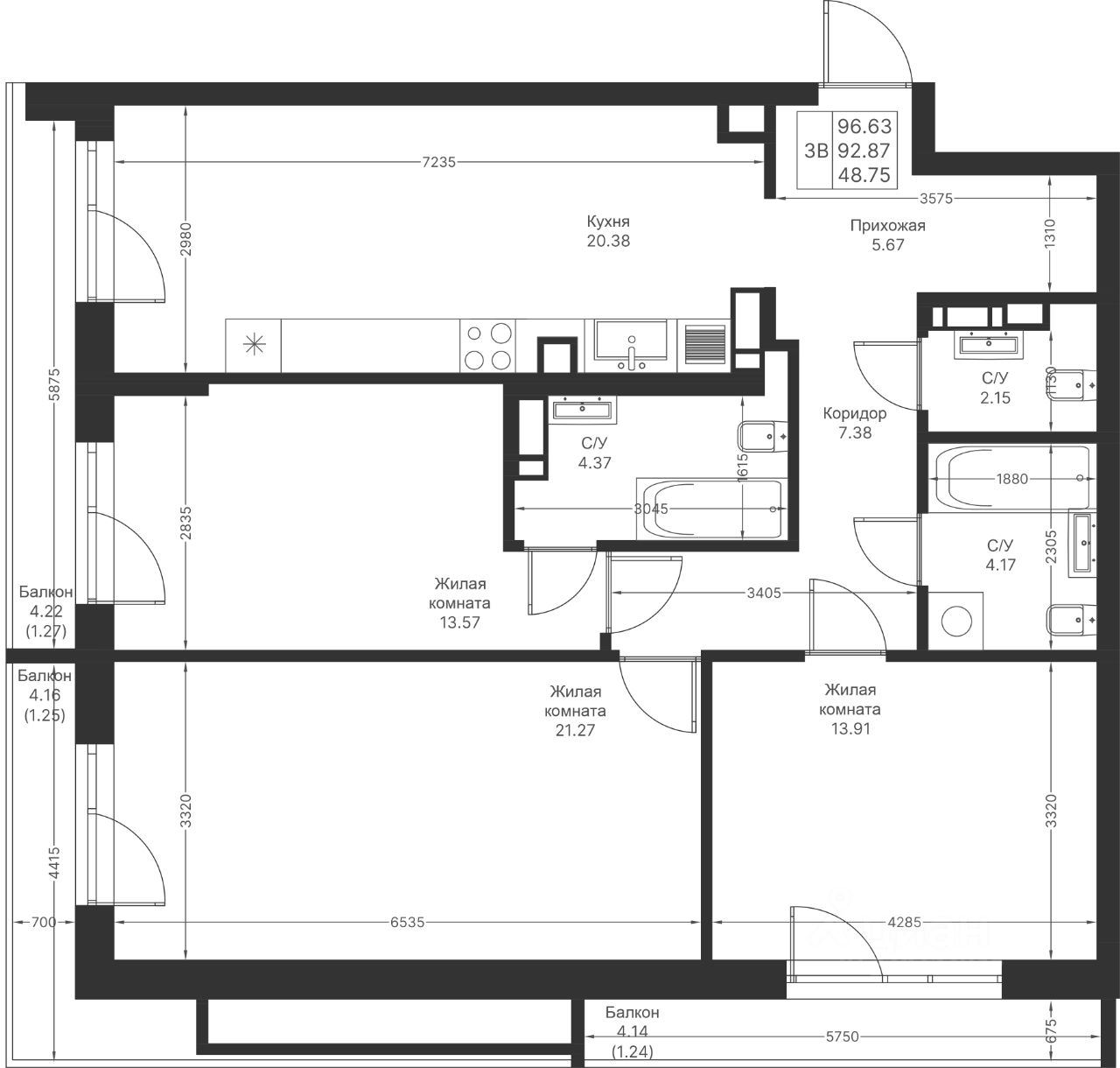 Продается 3-комнатная квартира 375 площадью 96,63 кв.м на 8 этаже в строящемся доме проекта "Мой Ритм" компании "Ак Барс Дом".
