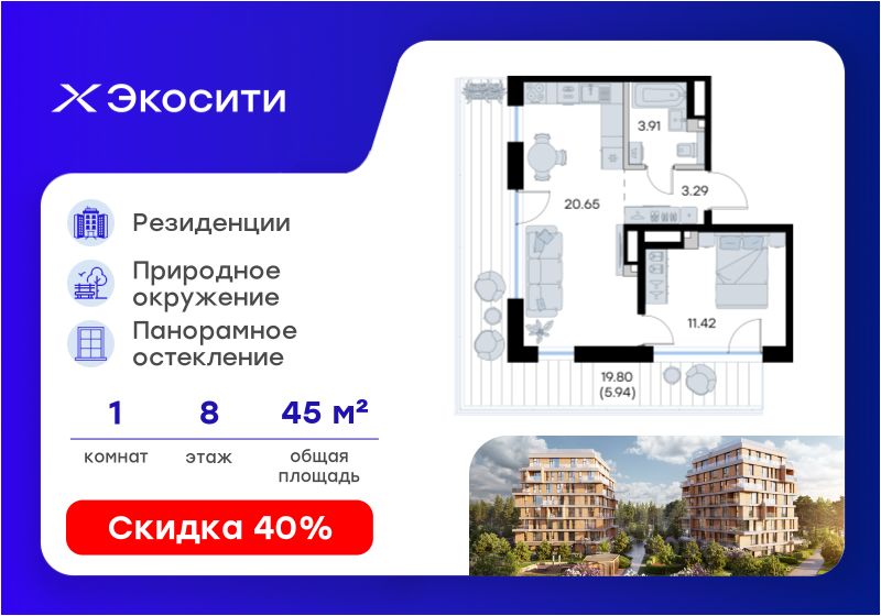 Продается 1-комн. квартира на 8-м этаже в строящемся проекте Экосити. Общая площадь лота составляет 45,21 кв. м, из которых 11,42 кв. м отведено под жилую и 20,65 кв. м под кухонную зону. Номер квартиры - 44