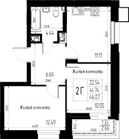 Продаётся 2-комнатная квартира 37 общей площадью 46.07 кв.м., на 4 этаже 13 этажного дома.