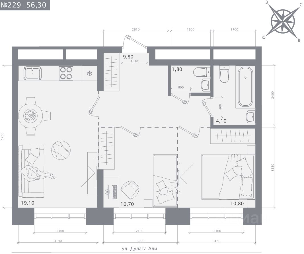 Продаётся 2-комнатная квартира в строящемся доме (Дом 2), срок сдачи: IV-кв. 2027, общей площадью 56.3 кв.м., на 4 этаже.