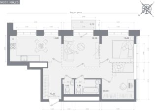 Продаётся 3-комнатная квартира в строящемся доме (Дом 2), срок сдачи: IV-кв. 2027, общей площадью 66.7 кв.м., на 14 этаже.