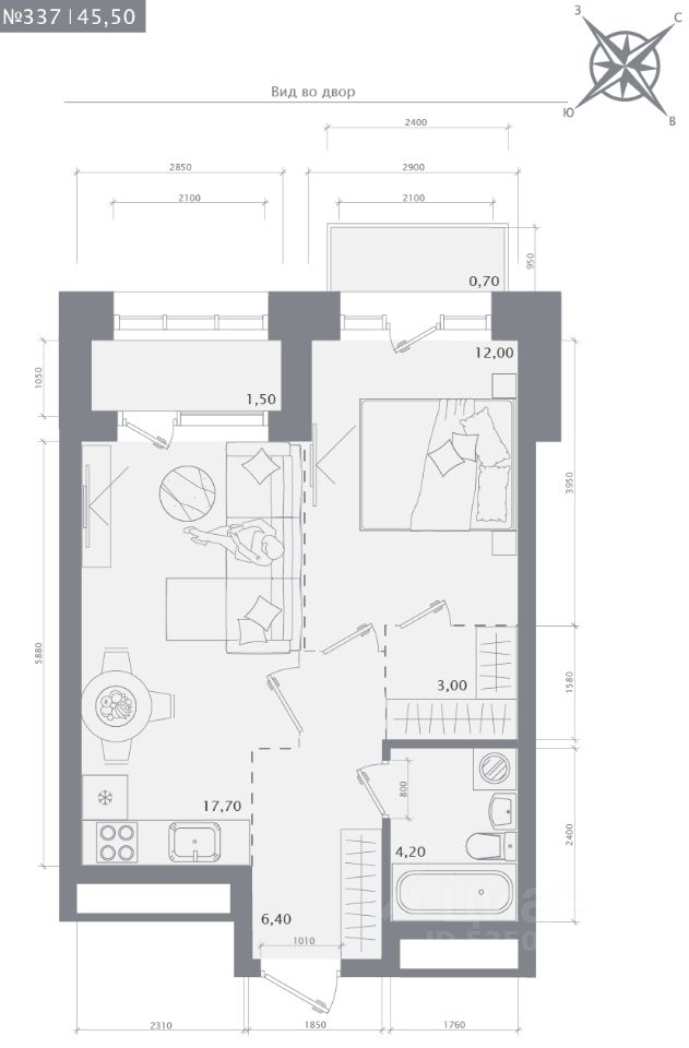 Продаётся 1-комнатная квартира в строящемся доме (Дом 2), срок сдачи: IV-кв. 2027, общей площадью 45.5 кв.м., на 18 этаже.