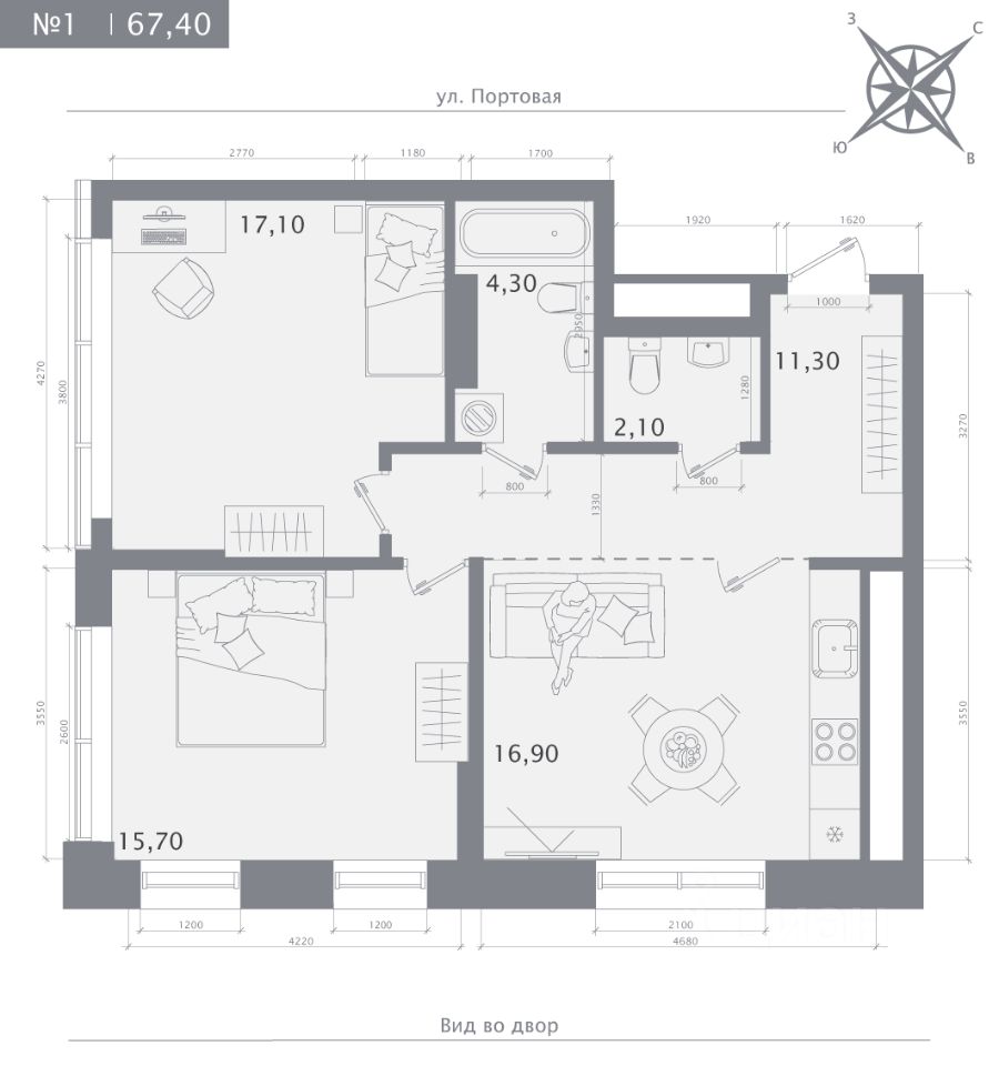 Продаётся 2-комнатная квартира в строящемся доме (Дом 1), срок сдачи: IV-кв. 2027, общей площадью 67.4 кв.м., на 2 этаже.
