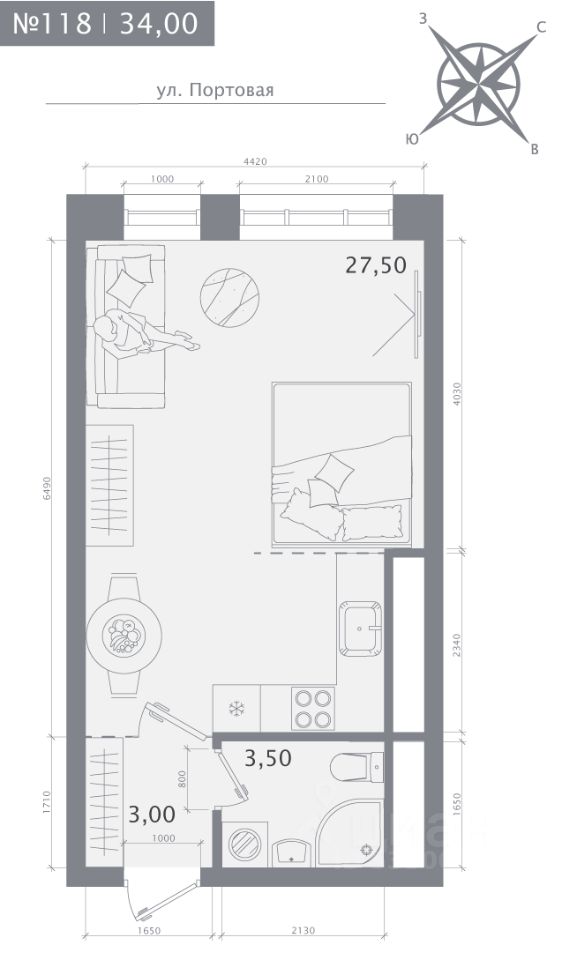 Продаётся студия в строящемся доме (Дом 1), срок сдачи: IV-кв. 2027, общей площадью 34 кв.м., на 5 этаже.