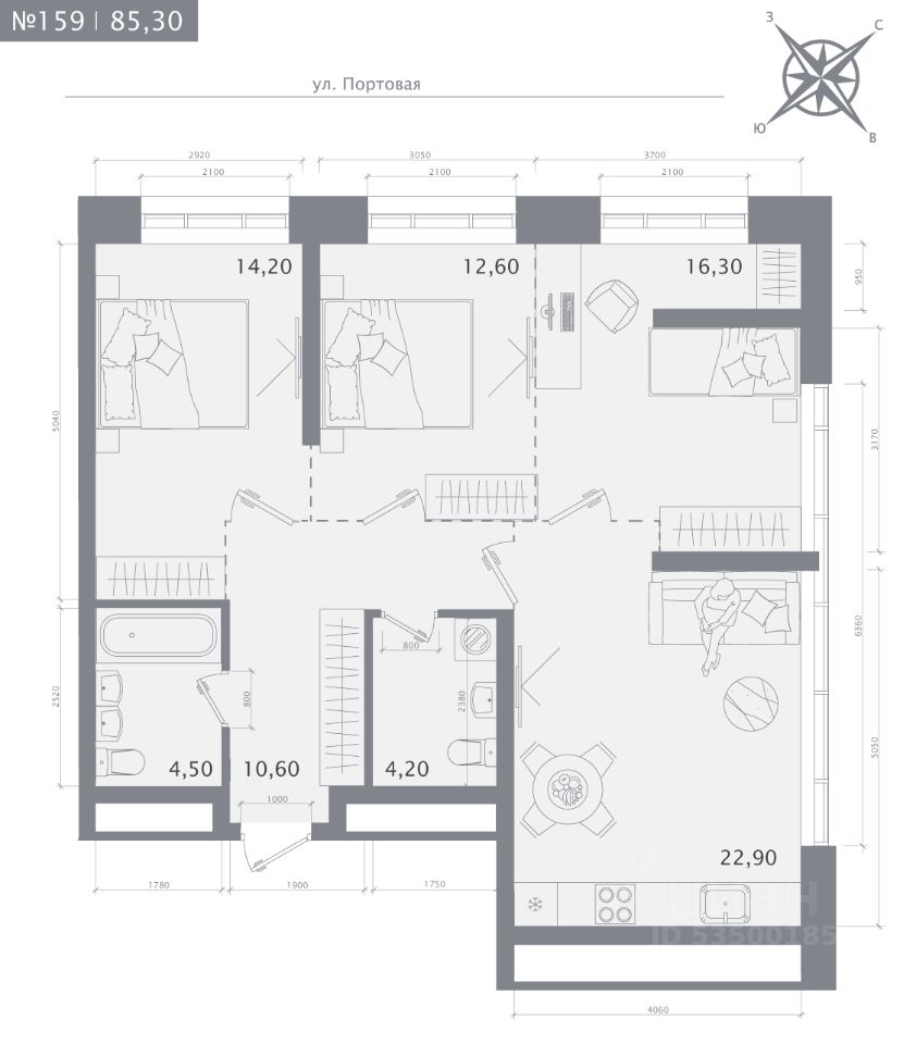 Продаётся 3-комнатная квартира в строящемся доме (Дом 1), срок сдачи: IV-кв. 2027, общей площадью 85.3 кв.м., на 10 этаже.