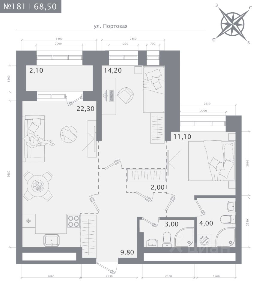 Продаётся 2-комнатная квартира в строящемся доме (Дом 1), срок сдачи: IV-кв. 2027, общей площадью 68.5 кв.м., на 13 этаже.