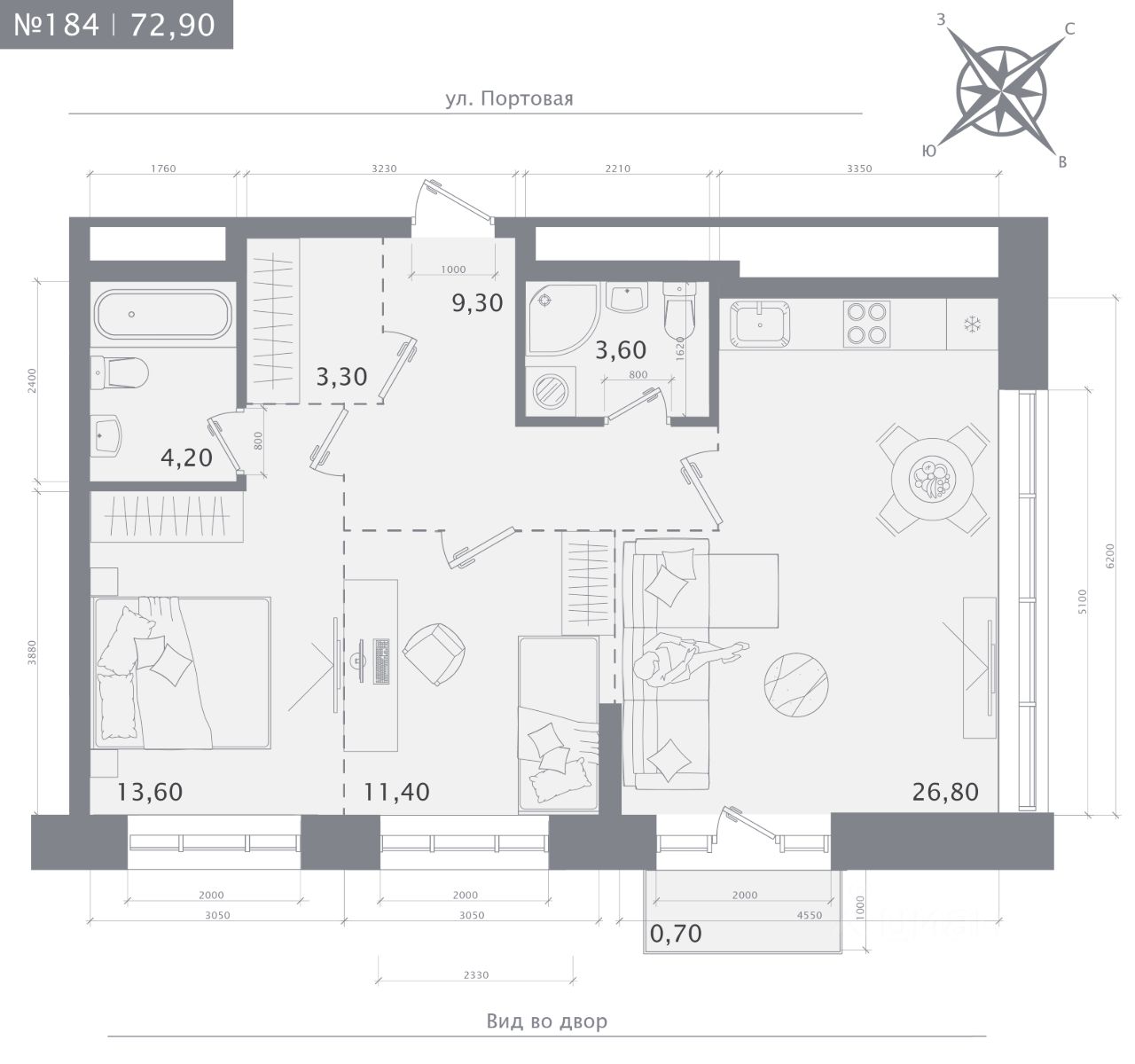 Продаётся 2-комнатная квартира в строящемся доме (Дом 1), срок сдачи: IV-кв. 2027, общей площадью 72.9 кв.м., на 13 этаже.