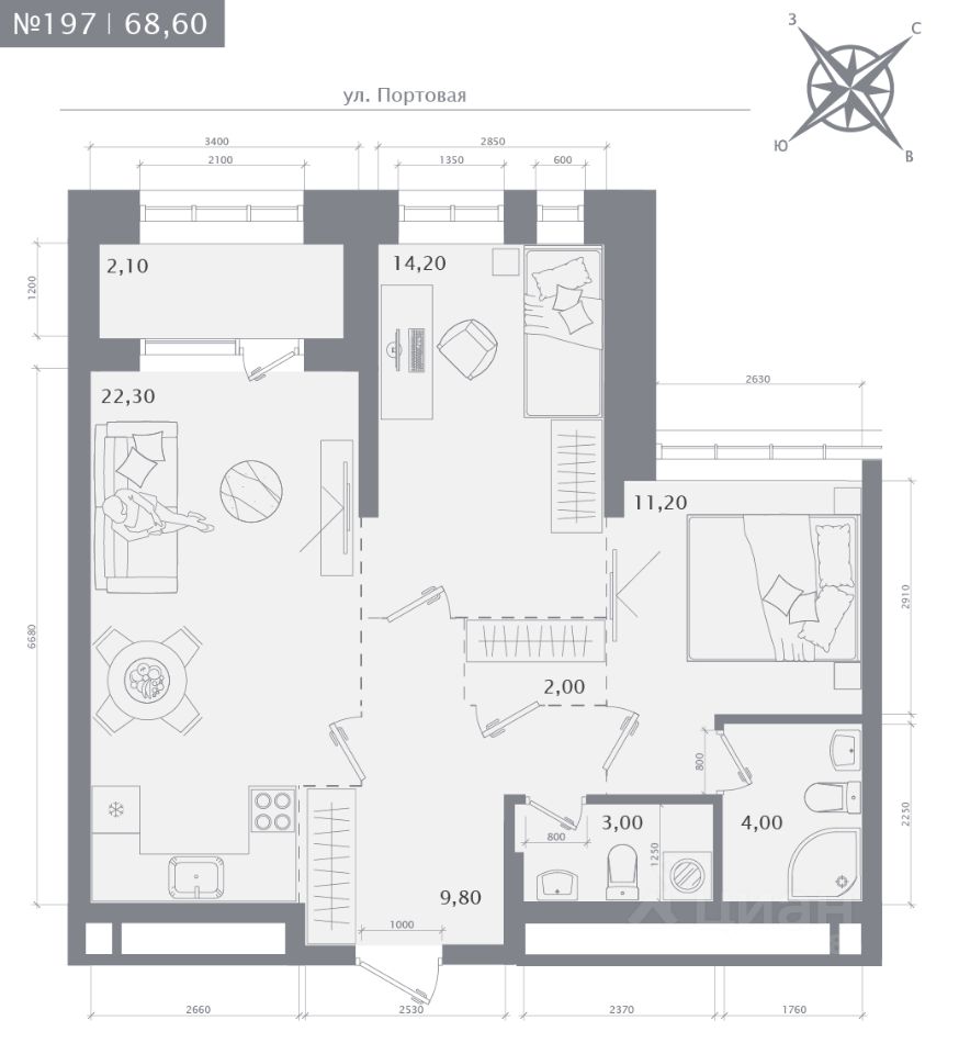 Продаётся 2-комнатная квартира в строящемся доме (Дом 1), срок сдачи: IV-кв. 2027, общей площадью 68.6 кв.м., на 15 этаже.
