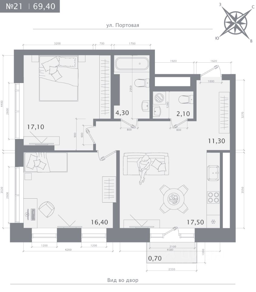 Продаётся 2-комнатная квартира в строящемся доме (Дом 1), срок сдачи: IV-кв. 2027, общей площадью 69.4 кв.м., на 6 этаже.