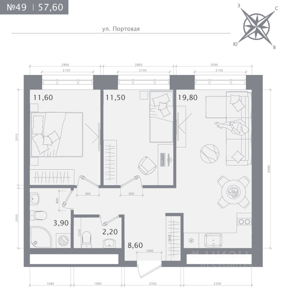 Продаётся 2-комнатная квартира в строящемся доме (Дом 1), срок сдачи: IV-кв. 2027, общей площадью 57.6 кв.м., на 9 этаже.
