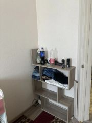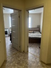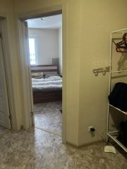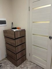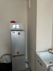 Не большая, но уютная комната, остаётся кровать, шкафчик на кухне, стол, табуретки. Кухня оборудована газовой плитой, холодильником, микроволновой печью. В квартире ремонт от застройщика, стены светлые, полы покрыты линолеумом, потолки натяжные.