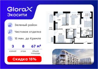 Продается 3-комн. квартира на 8-м этаже в строящемся проекте GloraX Экосити. Общая площадь лота составляет 67,17 кв. м, из которых 33,74 кв. м отведено под жилую и 0,00 кв. м под кухонную зону. Номер квартиры - 354