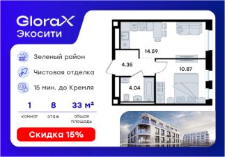 Продается 1-комн. квартира на 8-м этаже в строящемся проекте GloraX Экосити. Общая площадь лота составляет 33,85 кв. м, из которых 10,87 кв. м отведено под жилую и 14,59 кв. м под кухонную зону. Номер квартиры - 44