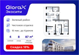 Продается 4-комн. квартира на 8-м этаже в строящемся проекте GloraX Экосити. Общая площадь лота составляет 87,11 кв. м, из которых 45,40 кв. м отведено под жилую и 23,55 кв. м под кухонную зону. Номер квартиры - 114