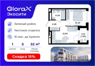 Продается 1-комн. квартира на 3-м этаже в строящемся проекте GloraX Экосити. Общая площадь лота составляет 32,85 кв. м, из которых 10,39 кв. м отведено под жилую и 12,59 кв. м под кухонную зону. Номер квартиры - 20