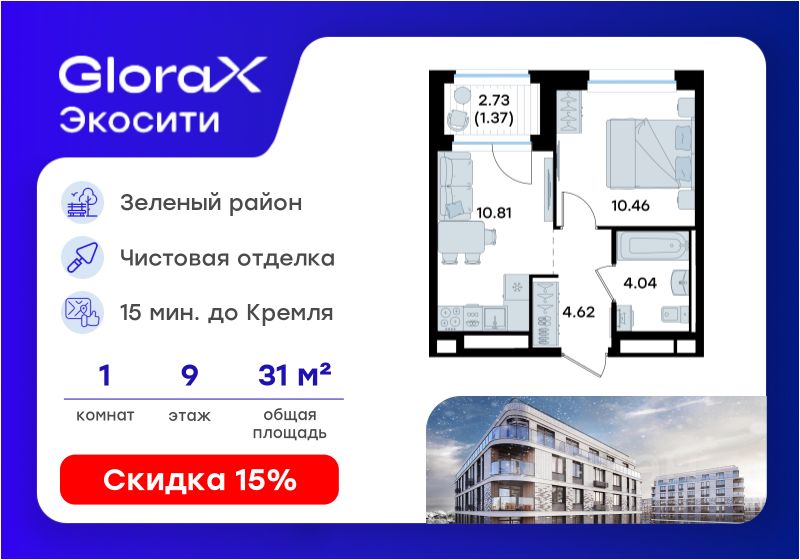 Продается 1-комн. квартира на 9-м этаже в строящемся проекте GloraX Экосити. Общая площадь лота составляет 31,30 кв. м, из которых 10,46 кв. м отведено под жилую и 10,81 кв. м под кухонную зону. Номер квартиры - 264