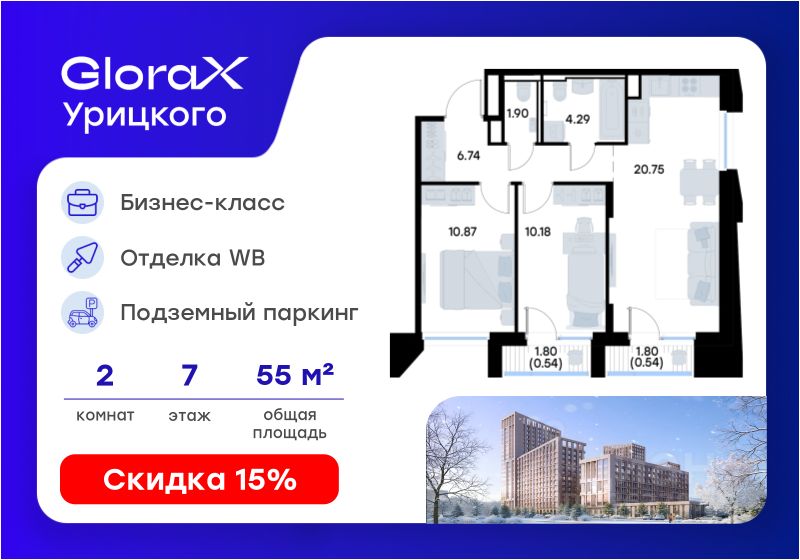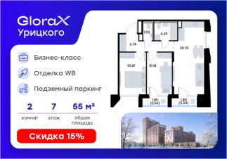 Продаётся 2-комнатная квартира в строящемся доме (Корпус 1), срок сдачи: II-кв. 2028, общей площадью 55.81 кв.м., на 7 этаже. GloraX Урицкого - это новый квартал, рожденный в сердце Московского района Казани, там, где встречаются энергия большого города и тишина старых парков. Проект создает пространство для тех, кто хочет чувствовать себя в центре событий, но при этом возвращаться домой в атмосферу уюта и спокойствия.