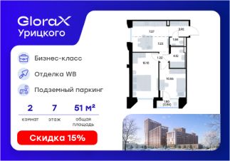 Продаётся 2-комнатная квартира в строящемся доме (Корпус 1), срок сдачи: II-кв. 2028, общей площадью 51.83 кв.м., на 7 этаже. GloraX Урицкого - это новый квартал, рожденный в сердце Московского района Казани, там, где встречаются энергия большого города и тишина старых парков. Проект создает пространство для тех, кто хочет чувствовать себя в центре событий, но при этом возвращаться домой в атмосферу уюта и спокойствия.