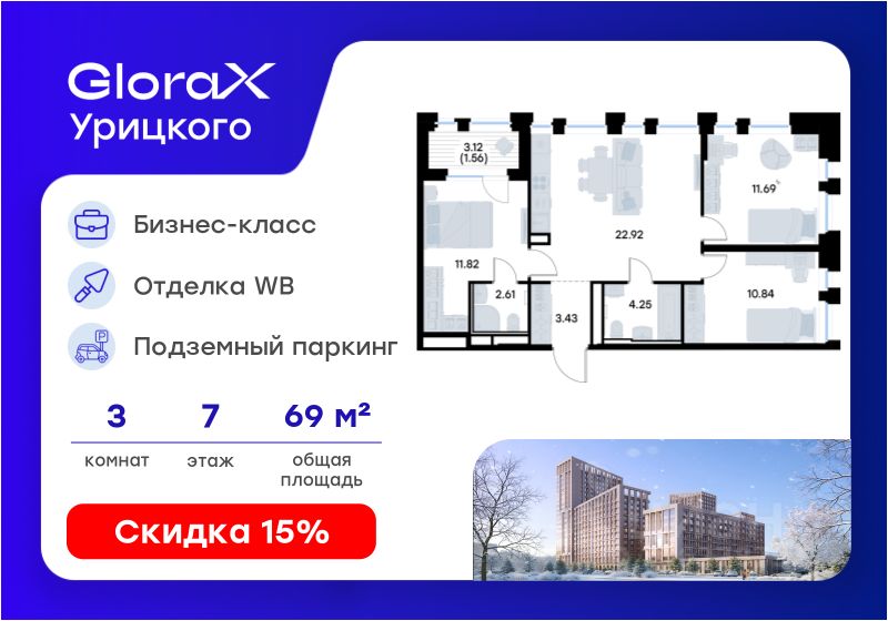 Продаётся 3-комнатная квартира в строящемся доме (Корпус 1), срок сдачи: II-кв. 2028, общей площадью 69.12 кв.м., на 7 этаже. GloraX Урицкого - это новый квартал, рожденный в сердце Московского района Казани, там, где встречаются энергия большого города и тишина старых парков. Проект создает пространство для тех, кто хочет чувствовать себя в центре событий, но при этом возвращаться домой в атмосферу уюта и спокойствия.