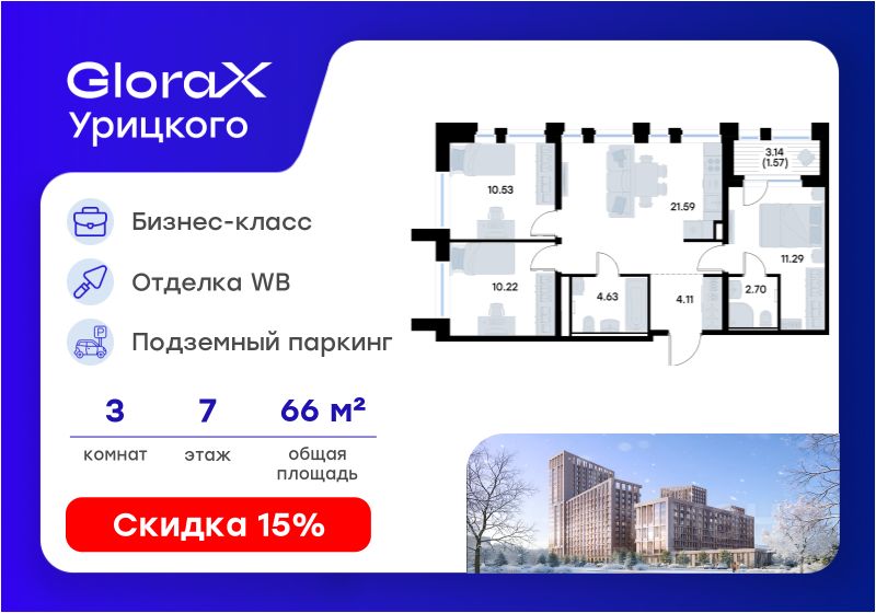 Продаётся 3-комнатная квартира в строящемся доме (Корпус 1), срок сдачи: II-кв. 2028, общей площадью 66.64 кв.м., на 7 этаже. GloraX Урицкого - это новый квартал, рожденный в сердце Московского района Казани, там, где встречаются энергия большого города и тишина старых парков. Проект создает пространство для тех, кто хочет чувствовать себя в центре событий, но при этом возвращаться домой в атмосферу уюта и спокойствия.