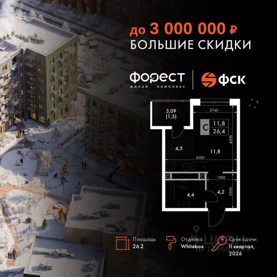Продаётся квартира-студия номер 62 общей площадью 26.2 кв.м. на 7-м этаже 7 этажного здания. Отделка Whitebox. Цена с учётом скидки.