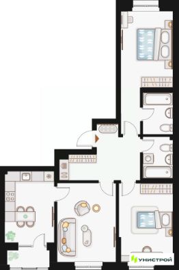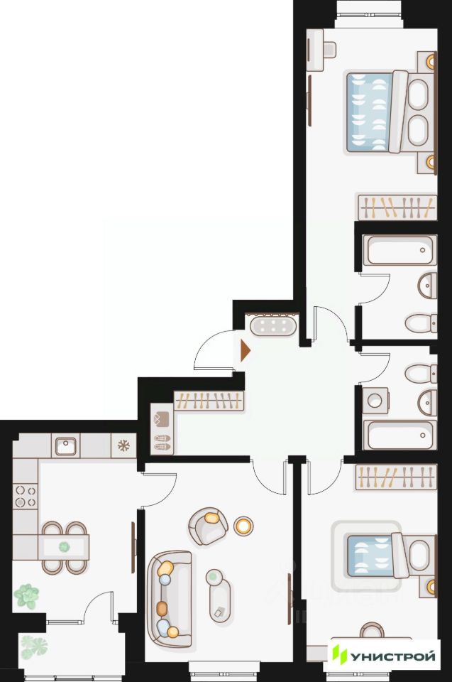 В квартирах выполняется предчистовая отделка с использованием качественных материалов: металлические двери, тепло- и шумоизоляция, энергоэффективные стеклопакеты, скрытая разводка коммуникаций и радиаторы с терморегуляцией.