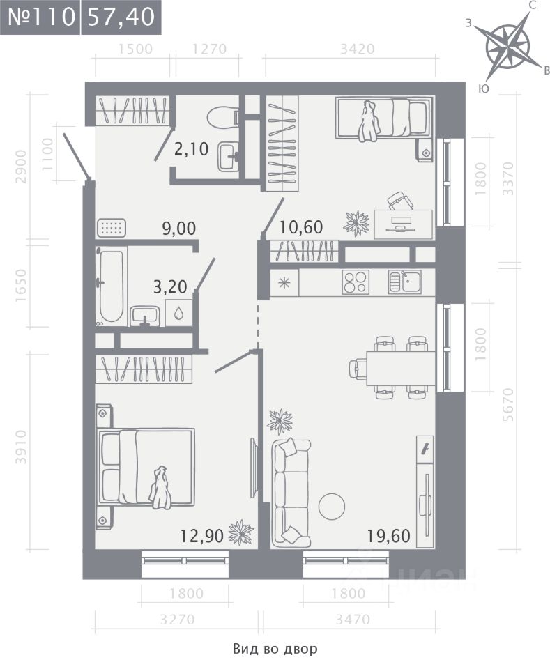 Продаётся 2-комнатная квартира в строящемся доме (Корпус 2), срок сдачи: I-кв. 2029, общей площадью 57.4 кв.м., на 9 этаже.
