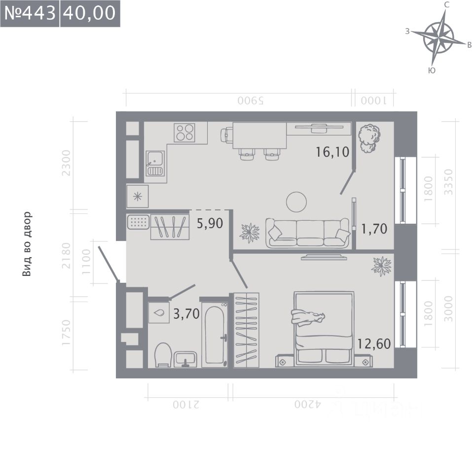 Продаётся 1-комнатная квартира в строящемся доме (Корпус 2), срок сдачи: I-кв. 2029, общей площадью 40 кв.м., на 5 этаже.