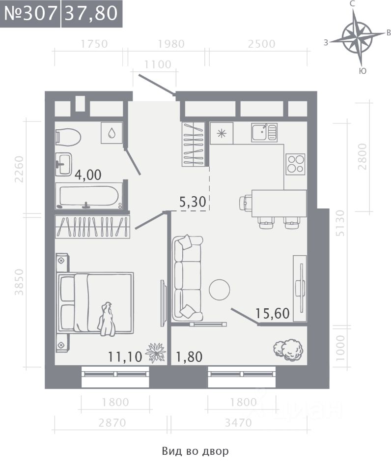 Продаётся 1-комнатная квартира в строящемся доме (Корпус 2), срок сдачи: I-кв. 2029, общей площадью 37.8 кв.м., на 7 этаже.