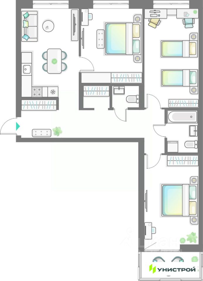 Представлен широкий выбор планировок — от студий до просторных семейных квартир. Доступны варианты с террасами, мастер-спальнями и гардеробными. Во всех квартирах выполнена качественная предчистовая отделка.