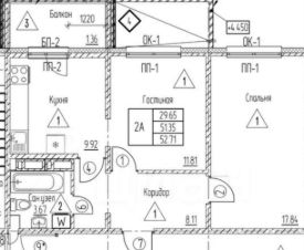 -общая площадь: 52.5 кв м.