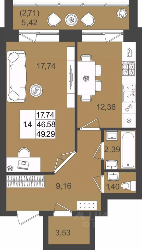 Дом 5, квартира 14 в 49,29 кв.м. на 2 этаже 5-эт. дома.