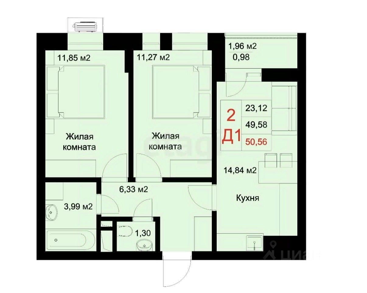 Удачная планировка кухня гостиная 14,84кв.м, 2 раздельные спальные комнаты 11,85/11,27кв.м, раздельные сан.узлы.