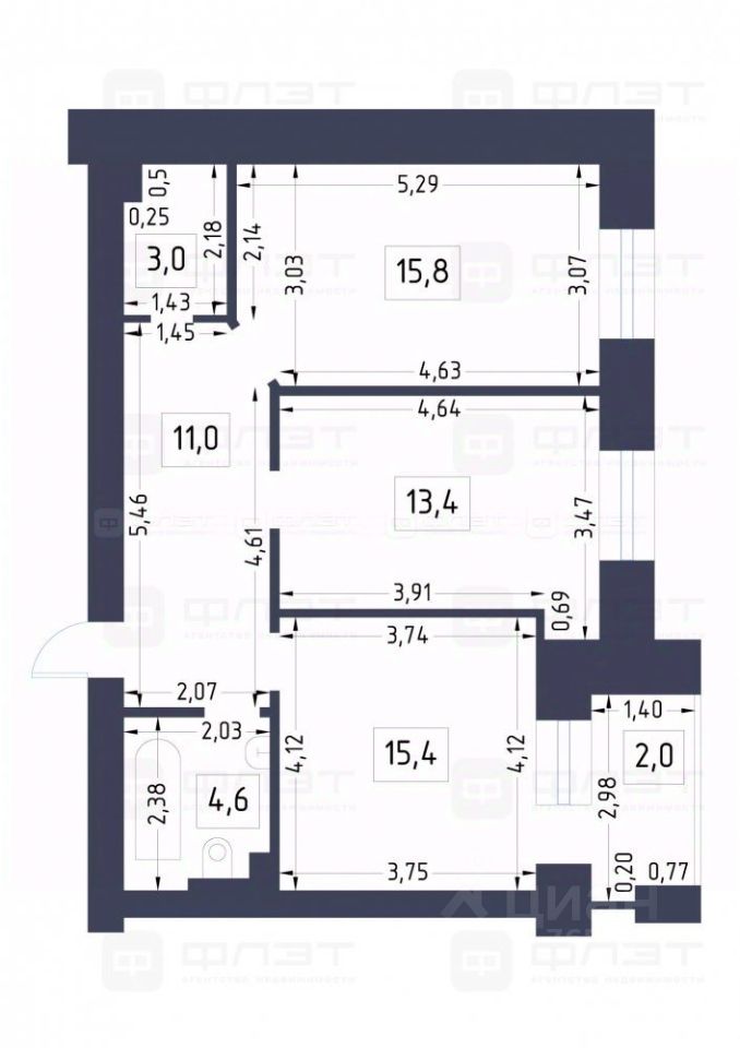 Просторные светлые комнаты 15,8 и 13,4 м2.