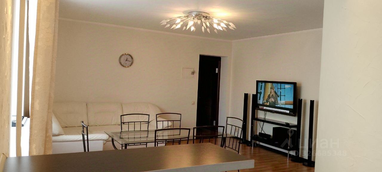 Просторная гостиная(30.4кв.м), оснащена современным гарнитуром и техникой. В гостиной телевизор и удобный кожанный диван. В комнате (12.5кв.м) двуспальная кровать , в другой комнате(10.1кв.м) мягкий диван, встроенный шкаф.