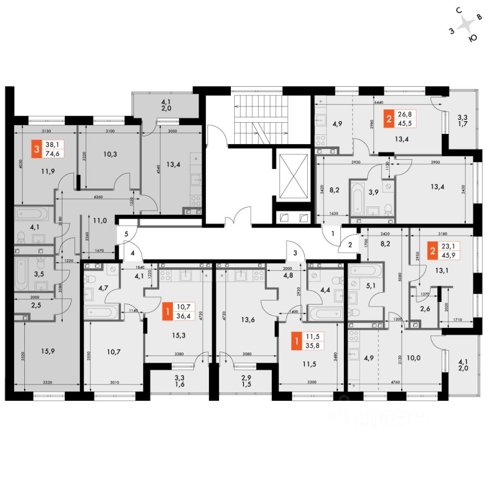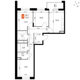 Продаётся 3-к квартира номер 75 общей площадью 74.6 кв.м. на 3-м этаже 6 этажного здания. Отделка Whitebox. Цена с учётом скидки.