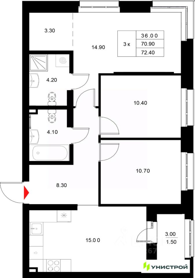 Квартиры: от 28 до 99 м², 79 планировок, высота потолков 2,7 м.