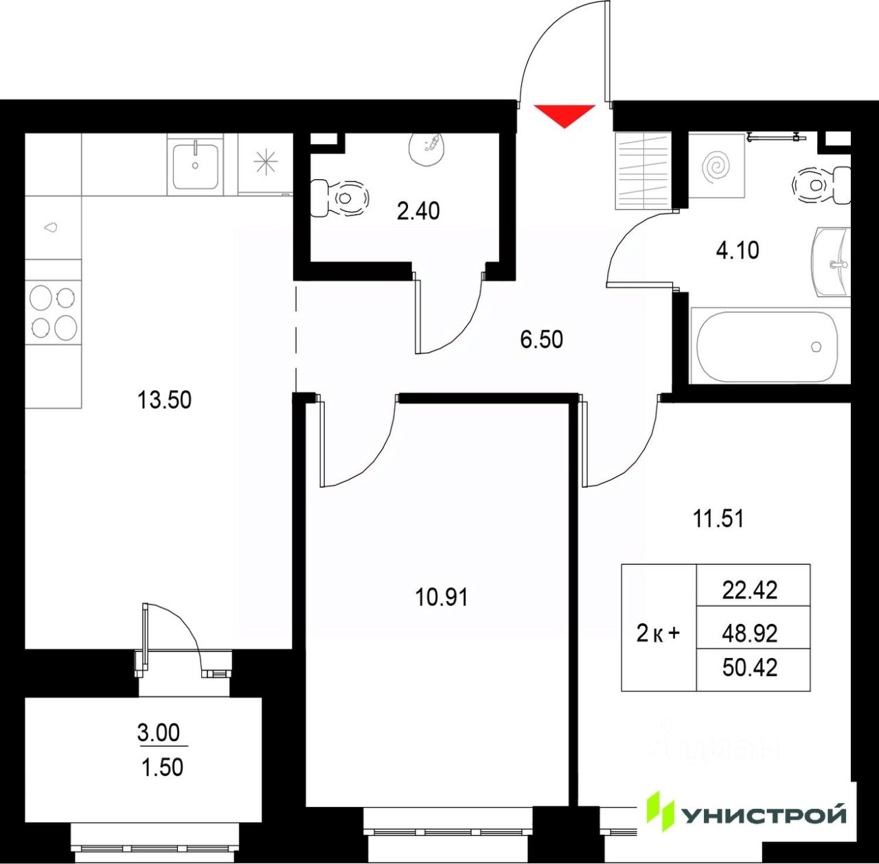 Общая площадь50,42 м²