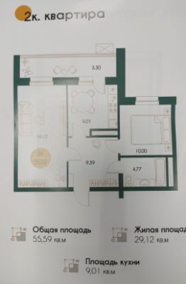 Общей площадью :55,59 кв.м., жилой 29,12 кв.м., кухня 9,01 кв.м.