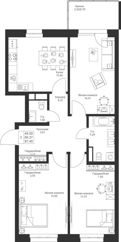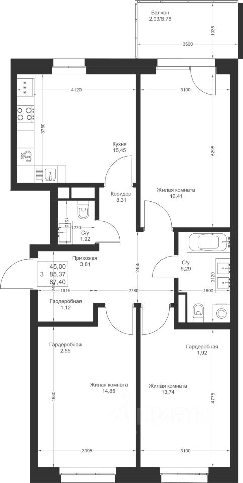 Комфортная 3-комнатная квартира с отдельной кухней и двумя санузлами. В квартире есть просторный балкон, где вы сможете организовать уютное место для отдыха.