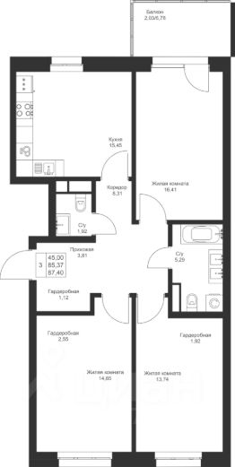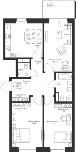 Продается 3-комнатная квартира 7 площадью 87,4 кв.м на 2 этаже в строящемся доме проекта "Новый свет" компании "Ак Барс Дом".
