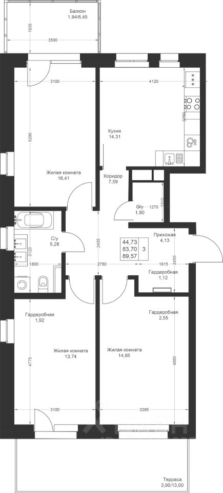 Продается 3-комнатная квартира 71 площадью 89,57 кв.м на 2 этаже в строящемся доме проекта "Новый свет" компании "Ак Барс Дом".