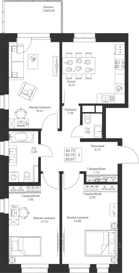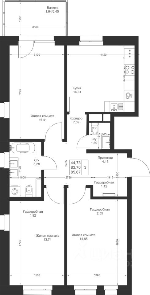 Продается 3-комнатная квартира 76 площадью 85,67 кв.м на 3 этаже в строящемся доме проекта "Новый свет" компании "Ак Барс Дом".