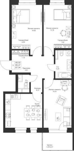 Продается 3-комнатная квартира 89 площадью 87,34 кв.м на 2 этаже в строящемся доме проекта "Новый свет" компании "Ак Барс Дом".