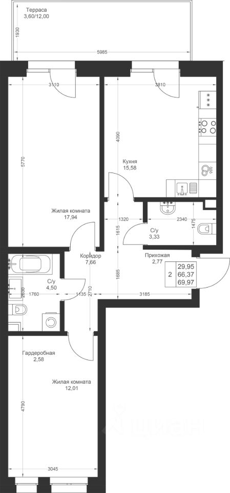 Продается 2-комнатная квартира 123 площадью 69,97 кв.м на 1 этаже в строящемся доме проекта "Новый свет" компании "Ак Барс Дом".