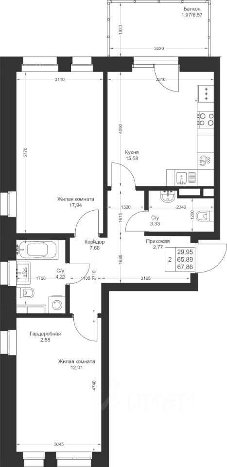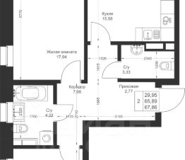 Продается 2-комнатная квартира 131 площадью 67,86 кв.м на 3 этаже в строящемся доме проекта "Новый свет" компании "Ак Барс Дом".