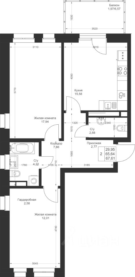 Продается 2-комнатная квартира 135 площадью 67,61 кв.м на 4 этаже в строящемся доме проекта "Новый свет" компании "Ак Барс Дом".