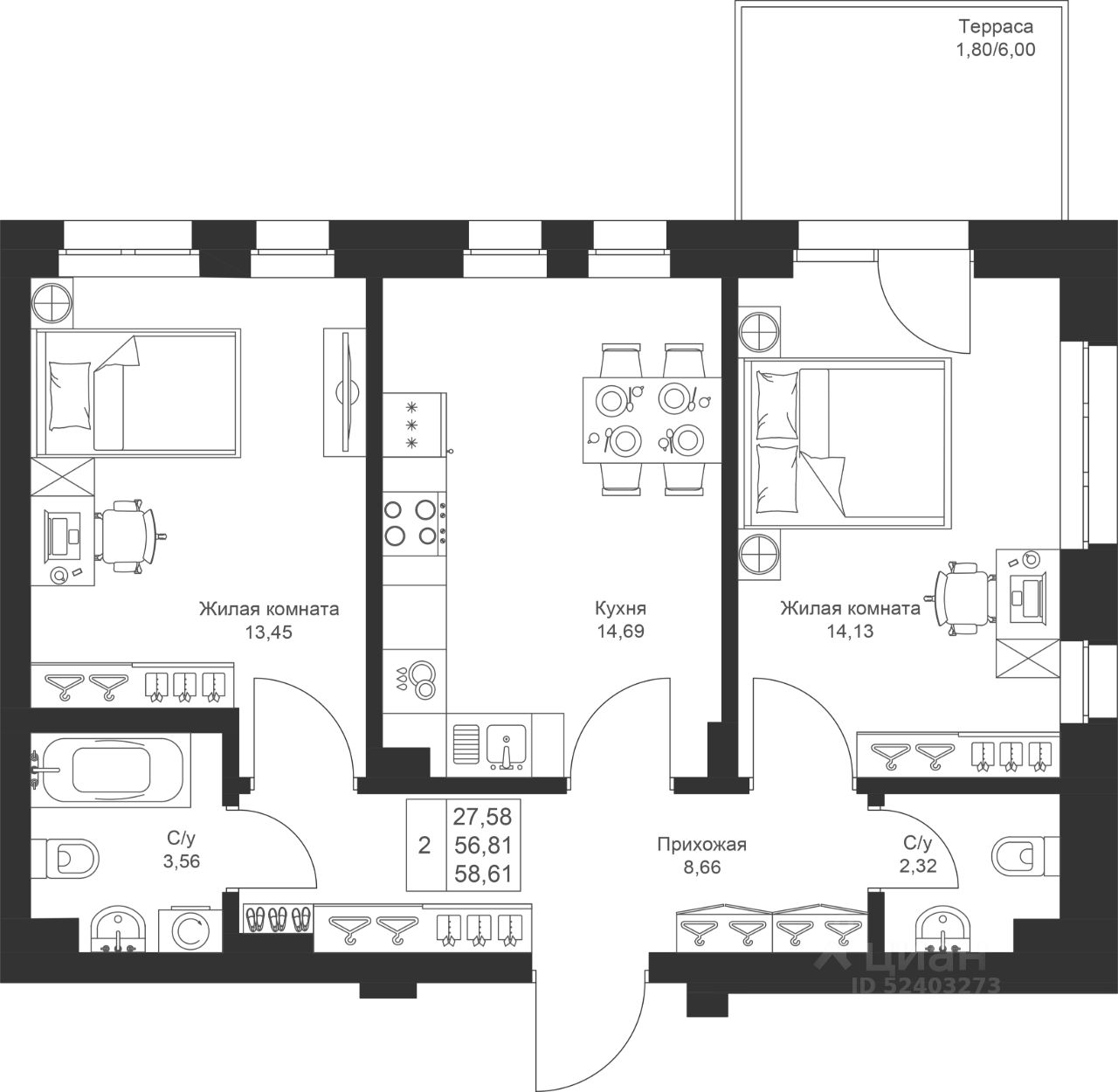 В проекте 2 отдельные комнаты для личного пространства домочадцев.