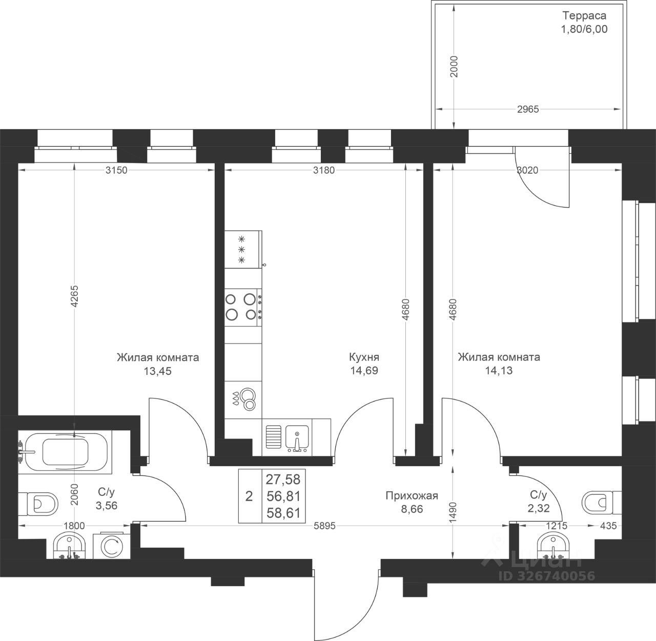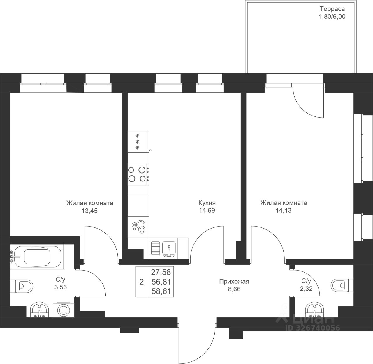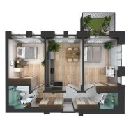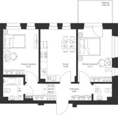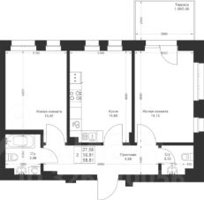 Продается 2-комнатная квартира 140 площадью 58,61 кв.м на 1 этаже в строящемся доме проекта "Новый свет" компании "Ак Барс Дом".